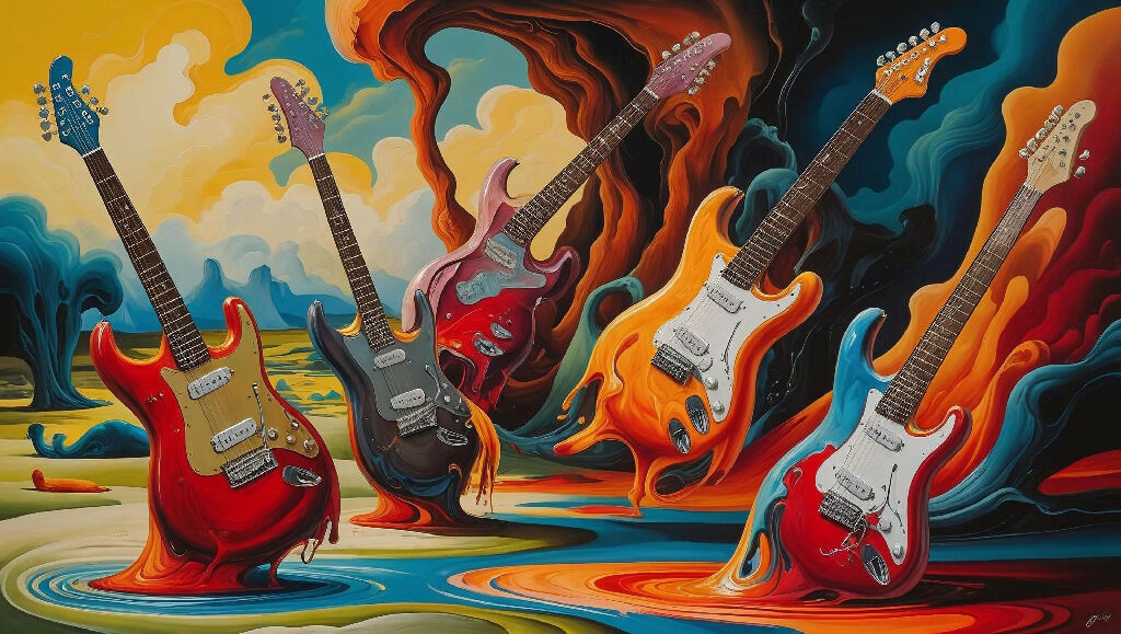 Surreal vivid Daliesque painting of guitars melting in the sun.
