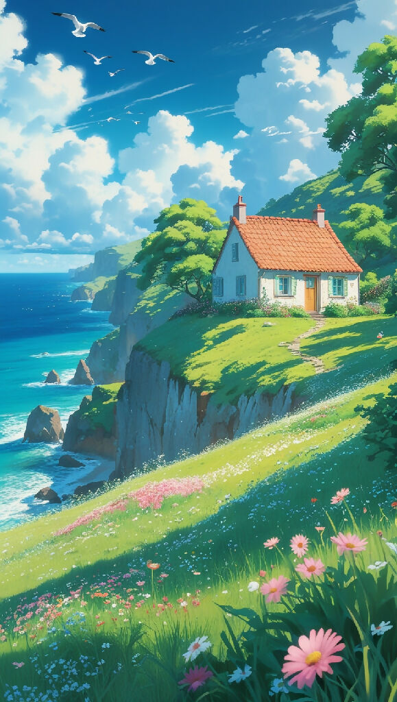 Whimsical, picturesque cottage perched on a cliff overlooking a vibrant, sun-drenched ocean. Rustic, charming cottage with a terracotta roof, nestled amid a hillside blanketed in wildflowers. Gentle slope of vibrant green grass dotted with a profusion of daisies and other wildflowers, in various shades of pink, red, and white. Cottage displays a traditional European architectural style. Coastal landscape, with dramatic cliffs leading to a turquoise ocean, blue sky filled with fluffy, soft white clouds. Detailed rendering of the foliage; lush, vibrant green trees and bushes. Peaceful and serene atmosphere, conveying a feeling of tranquility. Soft, diffused daylight casts gentle shadows on the hillside, highlighting the textures of the grass and rocks. Perspective is from a slightly elevated viewpoint, showcasing the expanse of the landscape. The overall impression is one of a happy, idyllic scene. Painterly style reminiscent of Studio Ghibli animation. Precise color palettes, blending natural, calming hues. Water color-like style, smooth textures, and a softness in the overall rendering style. Seagulls soar above the ocean, adding a touch of life to the scene.