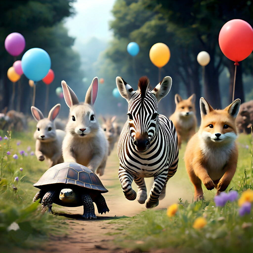 Step into a delightful world of whimsy with "Whimsical Animal Parade - AI Fantasy Illustration." This enchanting artwork showcases a lively procession of animals—a zebra, rabbits, a fox, and a tortoise—joyfully sprinting along a vibrant, nature-filled path. Surrounded by colorful balloons and blooming flowers, this AI-generated masterpiece exudes a playful and uplifting energy, making it an ideal choice for children’s decor, whimsical storytelling, and animal lovers alike.