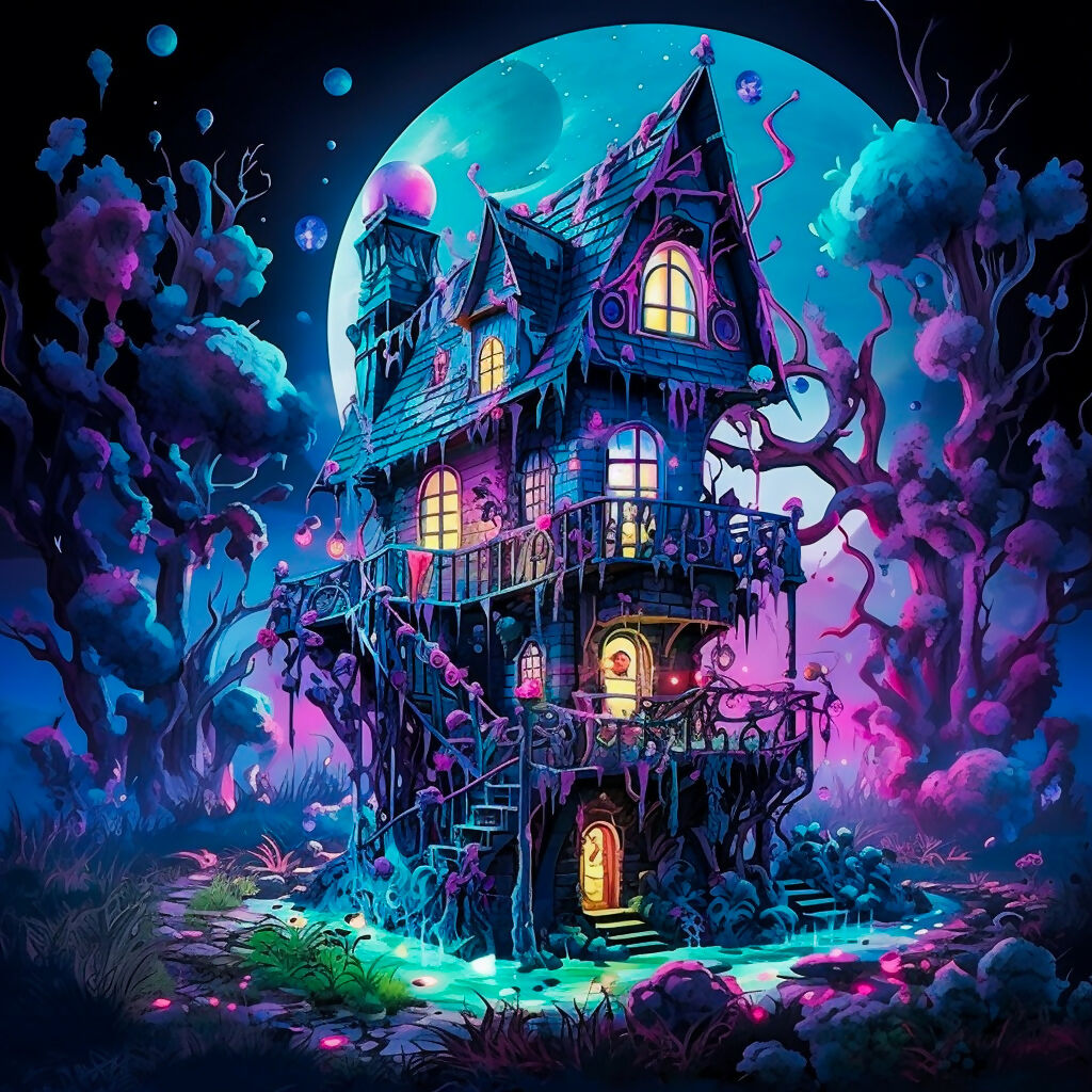 This delightful creation merges the playful charm of pastel goth style with the spooky allure of Halloween, resulting in a captivating visual treat. The house features bright, pastel colors that contrast beautifully with gothic architectural elements, creating a scene that is both enchanting and eerie. With its whimsical details and vibrant palette, this artwork captures the fun and mystery of a haunted house in a way that is both charming and spooky. Perfect for adding a touch of playful spookiness to any space, this piece is sure to delight and intrigue.