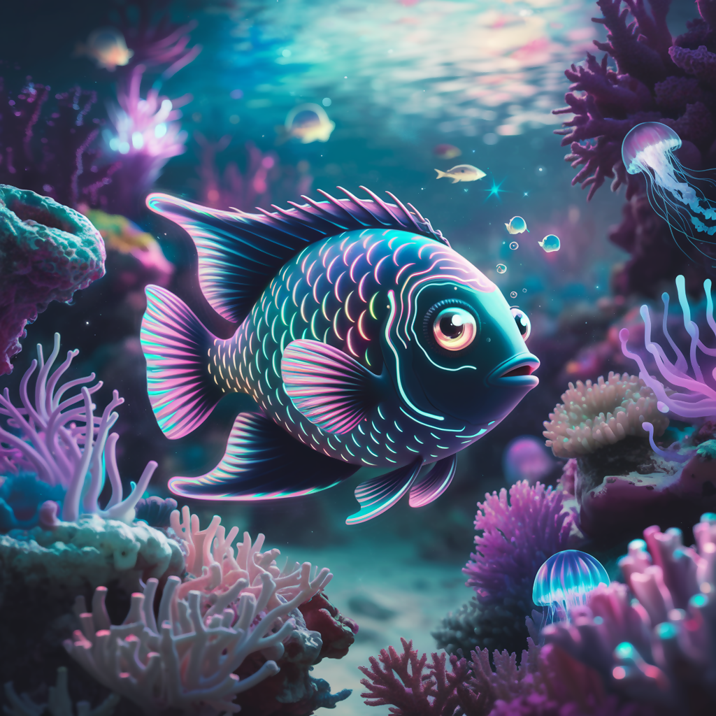 A whimsical fish with neon holographic patterns glowing on its scales, swimming in a vibrant coral reef. The fish's body glows with shifting rainbow colors, and its long, flowing fins resemble ribbons of light. The coral reef is alive with glowing, bioluminescent plants, anemones, and jellyfish, all pulsing with soft light in shades of purple, teal, and pink. The background water glows faintly with a dreamy, holographic shimmer.