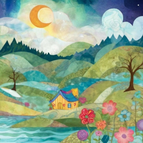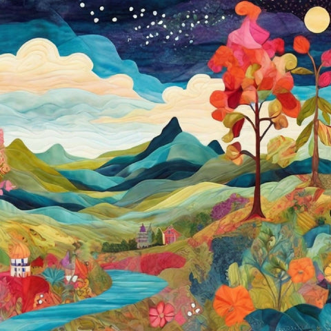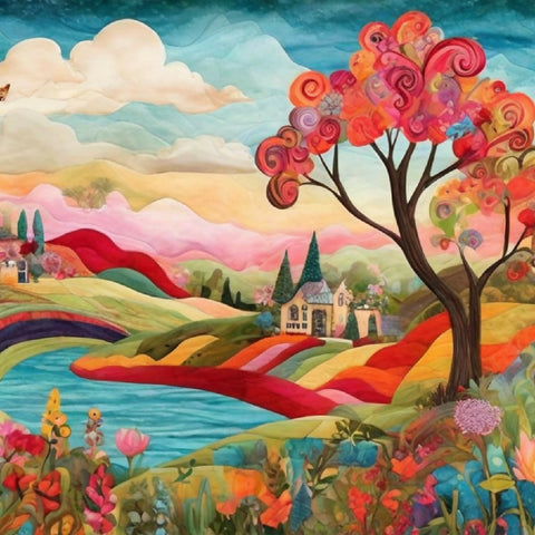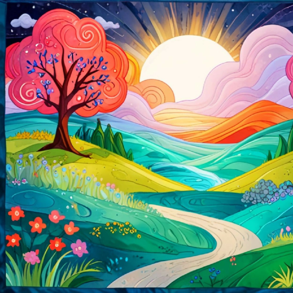 landscape depicting a magical valley at sunrise. The scene features a colorful sky with swirling pink and orange clouds, a large radiant sun, rolling green hills, a winding path, blooming wildflowers, and a striking red tree with blue leaves. The image exudes a dreamy, fairytale-like atmosphere.