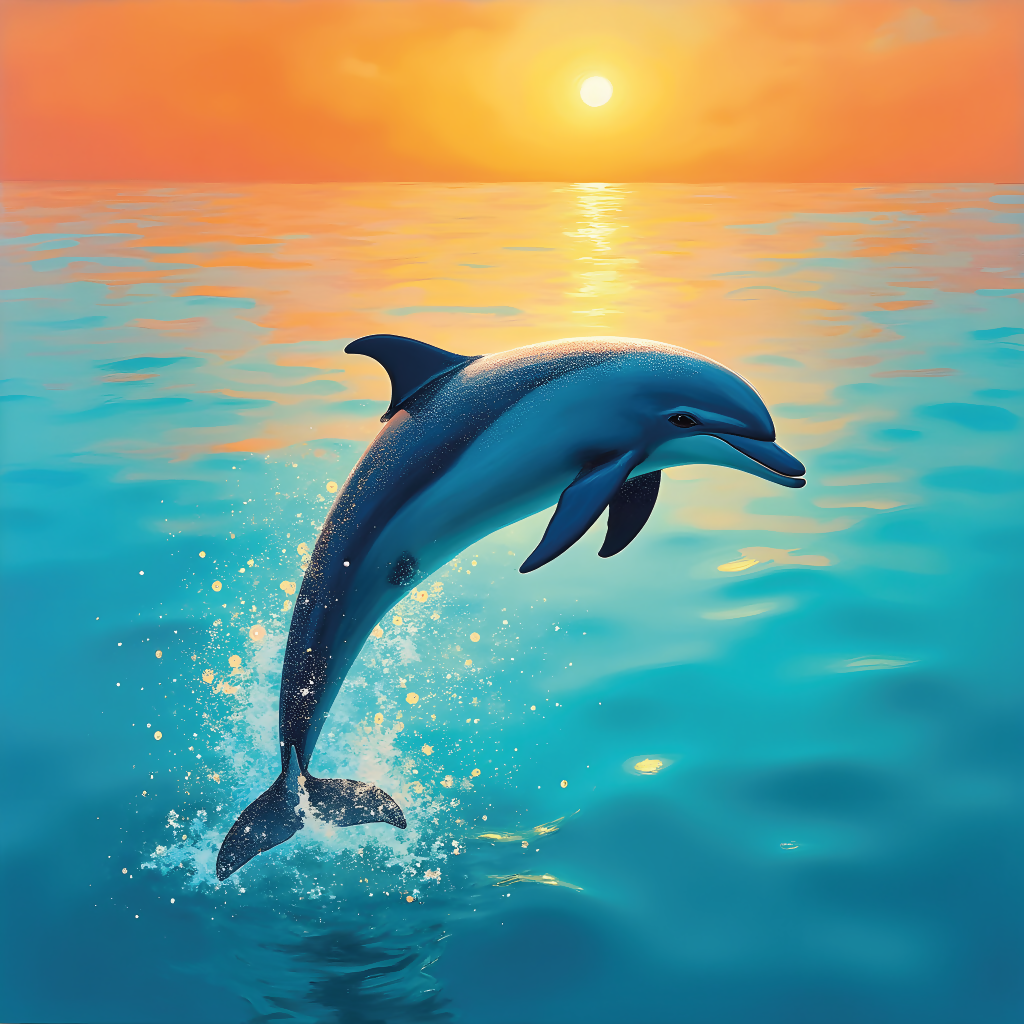 A playful dolphin, wearing a shimmering scales-like coat, jumping effortlessly out of crystal-clear turquoise water, surrounded by delicate, iridescent bubbles and warm, shimmering sunlight that dances across the rippling waves. The vibrant scene is rendered in abstract art style, reminiscent of Mark Rothko's bold color blocks, with complementary colors that evoke a sense of joy and energy, such as cobalt blue and burnt orange, set against a backdrop of soft, gradient hues. Fine details, inspired by the intricate patterns of Ernst Haeckel's illustrations, add a touch of whimsy and wonder to the composition, which is infused with the dreamy, ethereal quality of a Takashi Murakami painting.