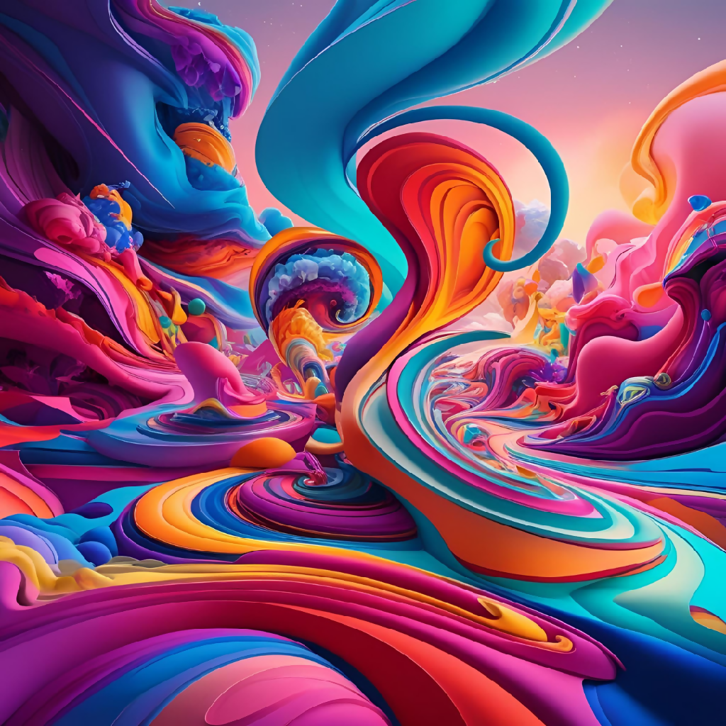This image presents a mesmerizing, surreal landscape bursting with vibrant, swirling colors. Bold ribbons of turquoise, magenta, orange, and yellow twist and flow through the scene, creating a sense of dynamic movement and energy. The abstract forms evoke the feeling of a fantastical dreamscape, where boundaries between sky, land, and imagination blur. The overall effect is both uplifting and hypnotic, inviting the viewer to get lost in its vivid, otherworldly beauty.