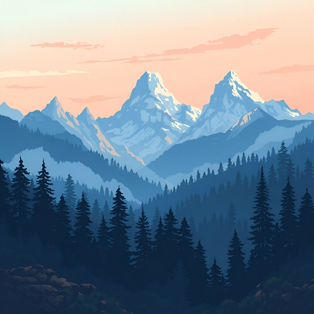 - Hyper-realistic morning mountain scene with mist and rich pine forests