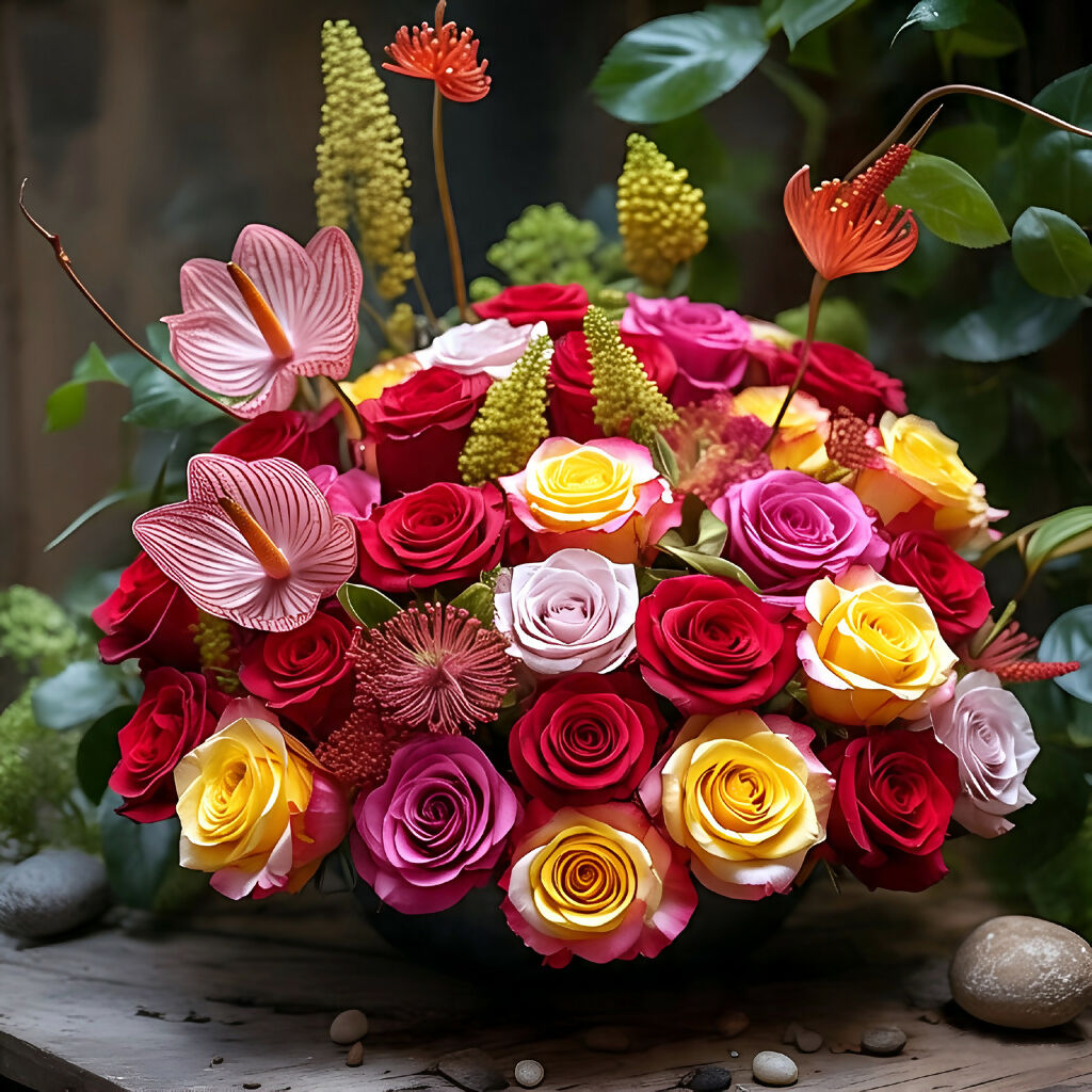 Step into a timeless moment where nature pauses to pose. Whispers of Bloom is a digitally crafted still life that captures the poetic silence of a floral bouquet in full glory. Each petal, from the fiery gloriosa lilies to the delicate pink anthuriums, tells a story of contrast—wild yet composed, vibrant yet serene. Inspired by the Dutch masters but reimagined through AI, this artwork invites viewers to reflect on fleeting beauty and the quiet power of arrangement. Perfect for interiors that crave warmth, elegance, and a touch of botanical drama.