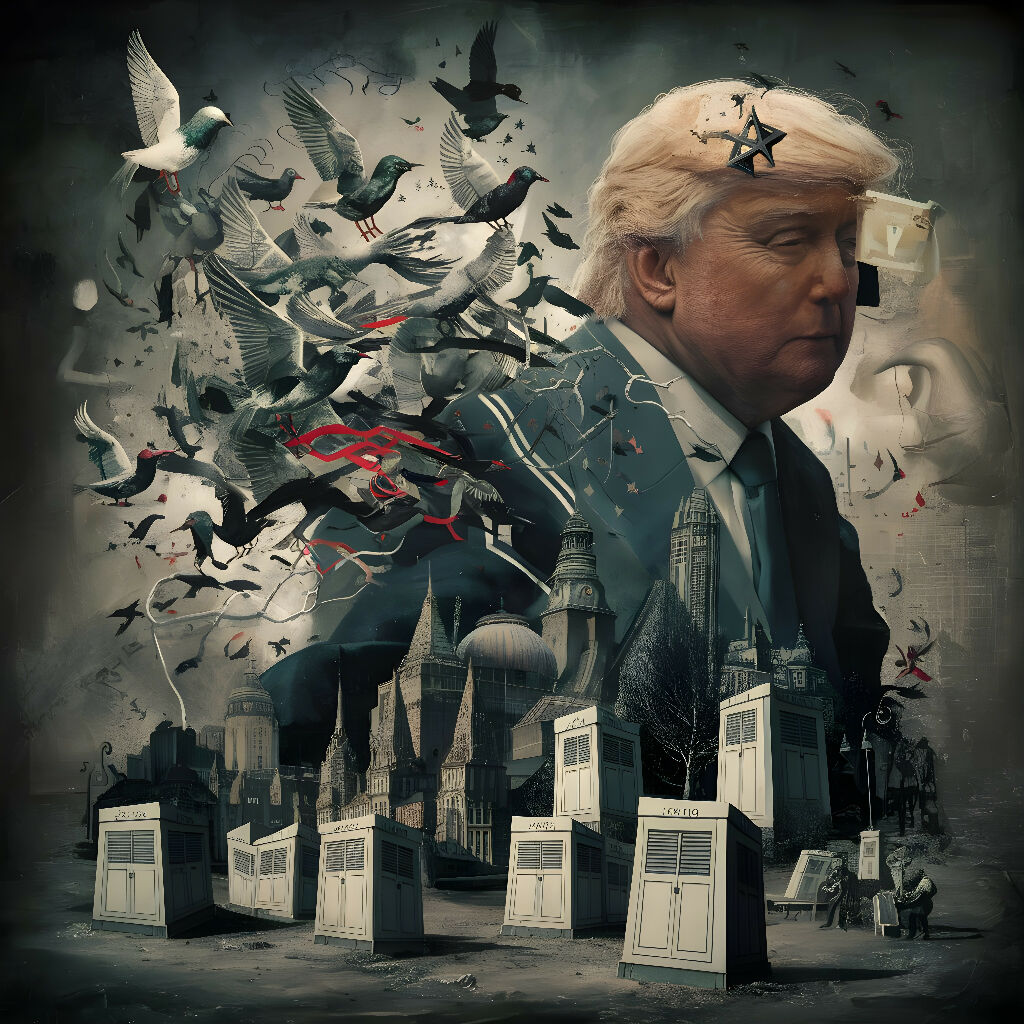 In this thought-provoking artwork, the artist has woven a surreal tapestry of chaos and order, epitomized by the towering figure of a man, which resembles a well-known public figure. His presence looms over a cityscape, surrounded by a whirlwind of pigeons, some depicted in mid-flight and others dissolving into abstract forms. These birds, often symbols of peace, seem disrupted, representing the turbulence and disorder of the current times.