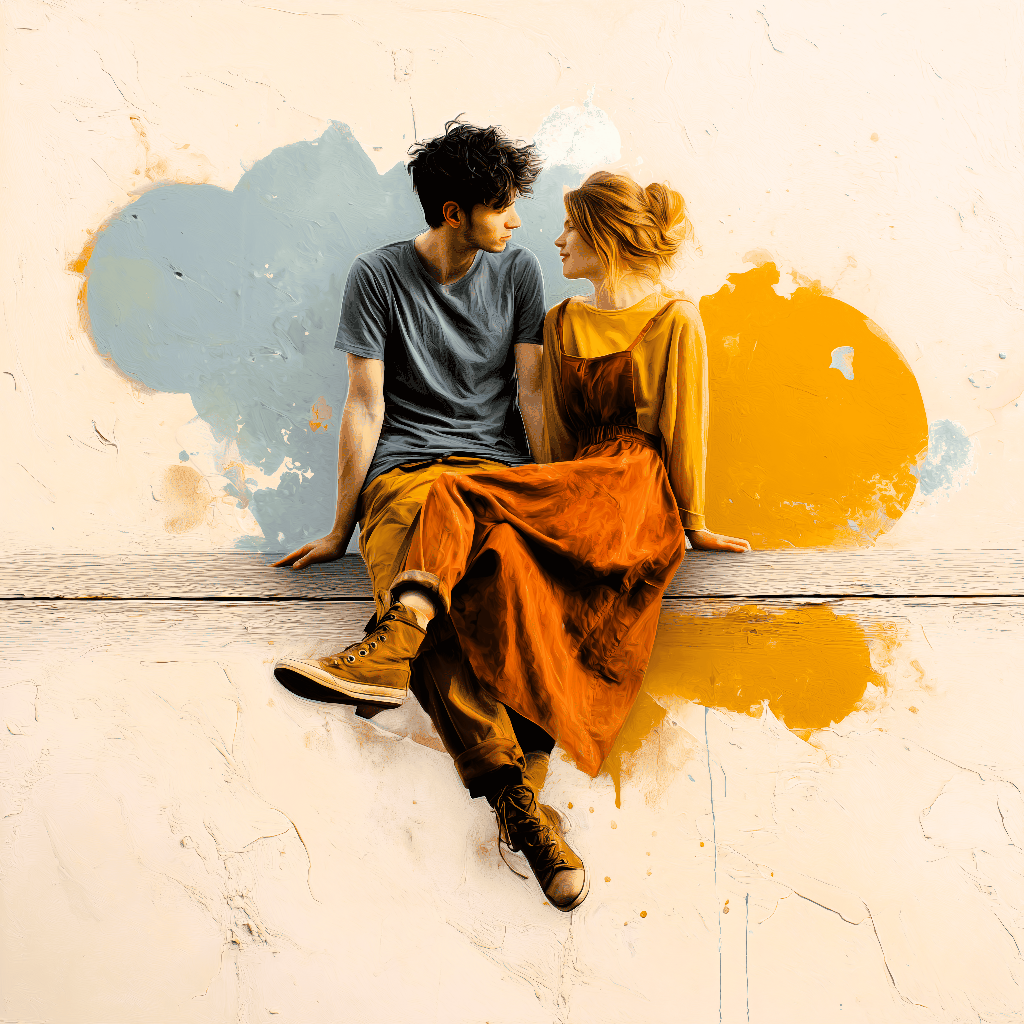 Capture the timeless magic of "Whispers of Creation #19: Eternal Glance", an AI-generated portrait that freezes a moment of pure connection. A young couple sits side by side on a weathered ledge, their profiles turned toward each other in quiet intimacy — his tousled dark hair and blue shirt blending into soft turquoise strokes, her warm amber dress and updo dissolving into golden paint splatters that bloom like sunlight behind them. Subtle textured canvas background, gentle cinematic lighting, highly detailed, high resolution. Created by artist Lumenforge, this piece whispers of unspoken love, shared dreams, and the beauty of simply being together. Perfect for evoking romance, serenity, and emotional warmth in any space.