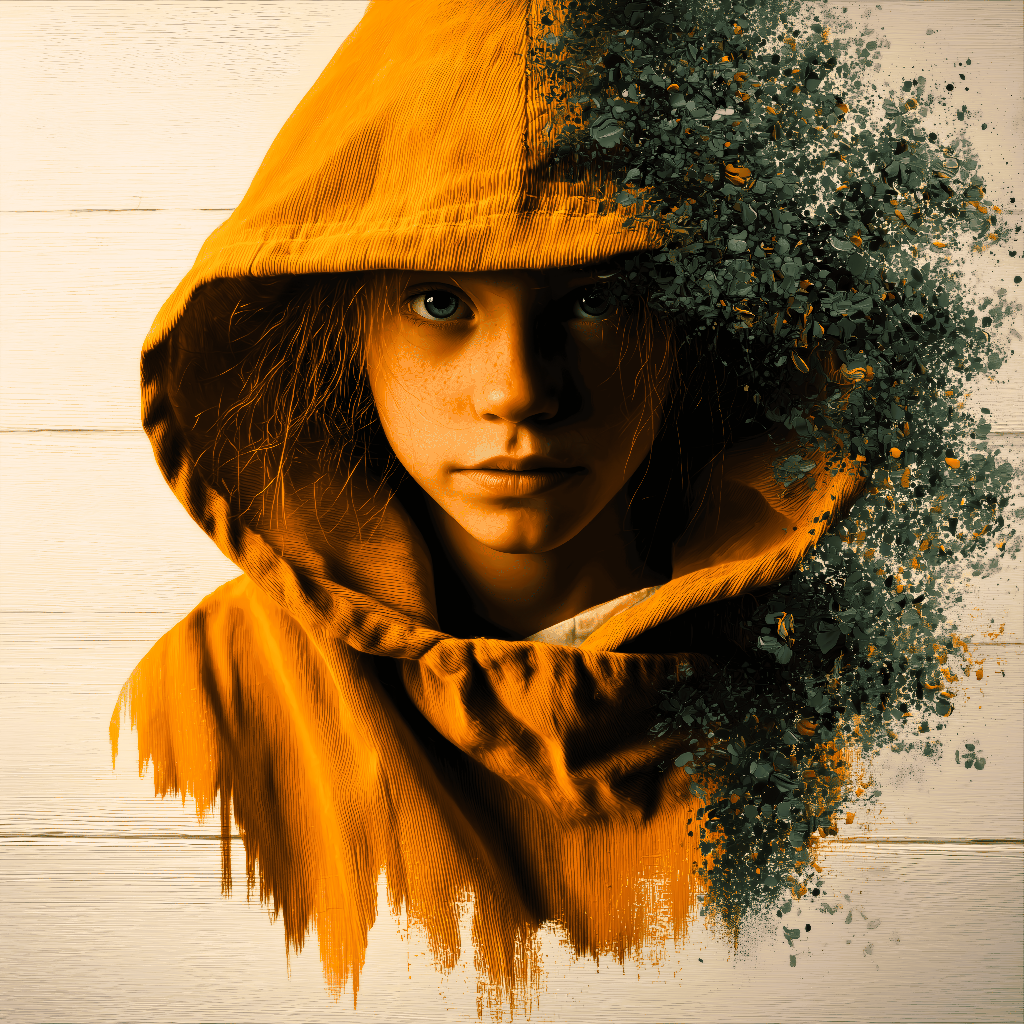 Dive into the intimate mystery of "Whispers of Creation #6: The Awakening Veil", an AI-generated portrait that captures the raw essence of transformation and rebirth. A young soul with piercing turquoise eyes stares directly at the viewer, half-hidden beneath an orange hooded cloak dissolving into a cascade of dark emerald leaves and organic fragments — symbolizing the eternal cycle of human and nature becoming one. Warm amber tones melt into deep greens, textured canvas background, dramatic cinematic lighting highlighting every freckle and strand of hair, hyper-detailed in 4K resolution. Created by artist Lumenforge, this emotional portrait whispers of hidden strength, fragility, and the quiet power of growth. Perfect for adding profound introspection and natural surreal beauty to your space.