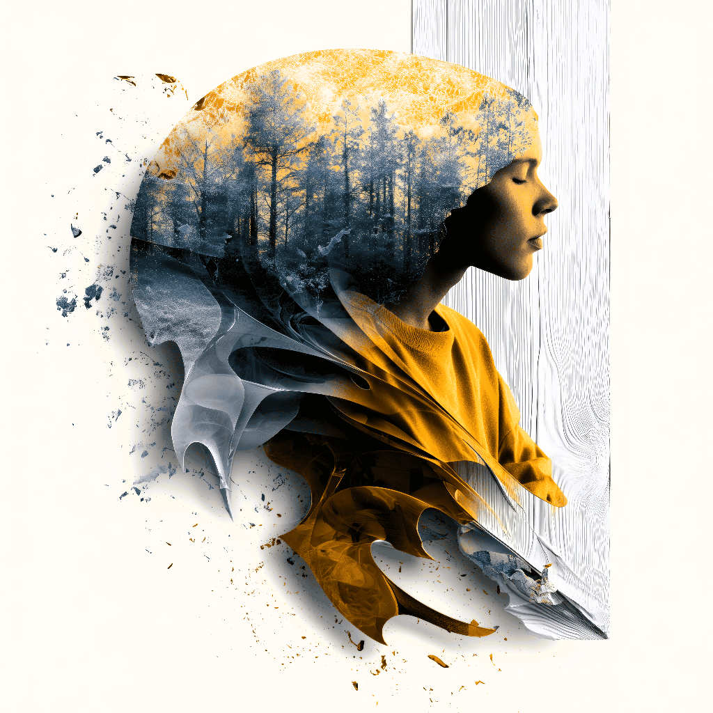 Dive into the serene introspection of "Whispers of Creation #7: Echoes of the Silent Forest", an AI-generated portrait that fuses human soul with ancient woodland. A peaceful young figure in profile, eyes gently closed, wears a mustard-yellow garment that morphs into flowing organic fabric and layered forest textures. Inside the silhouette, a golden autumnal forest glows softly — tall trees bathed in warm light dissolving into cool blue shadows — while fragments of bark and leaves scatter around the edges. Textured canvas feel, soft cinematic lighting, hyper-detailed in 4K resolution. Created by artist Lumenforge, this piece whispers of inner peace, deep connection to nature, and the quiet memories carried within us. Perfect for bringing calm, contemplation, and natural harmony to any space. Tags: