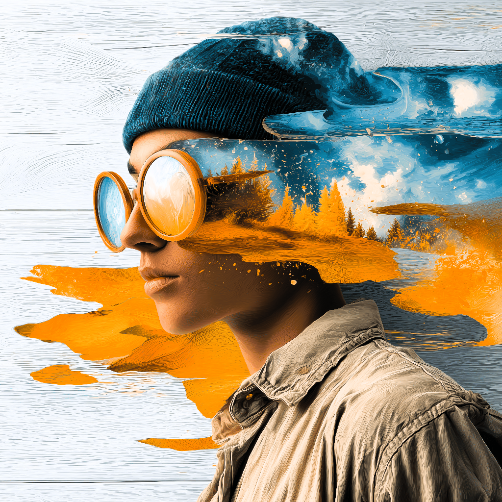 Tags: ai generated art,portrait ai art,whispers of creation,horizon behind the lens,reflective sunglasses,autumn landscape,double exposure,inner world,golden orange sky,stormy blue,beanie portrait,textured canvas,cinematic lighting,highly detailed,4k resolution,emotional surreal,lumenforge art Collections: Whispers of Creation, by LumenForge
