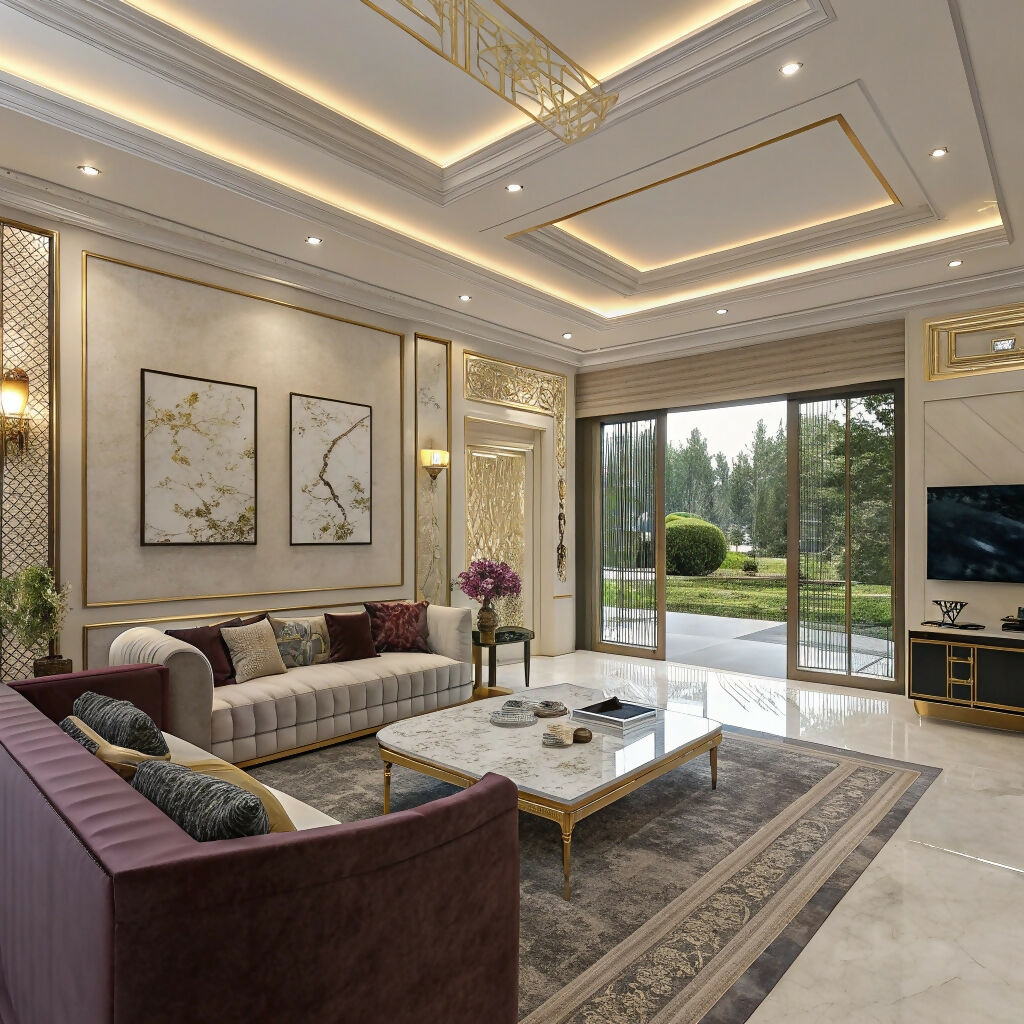 A large, light beige living room features a high ceiling with intricate gold-colored crown molding.