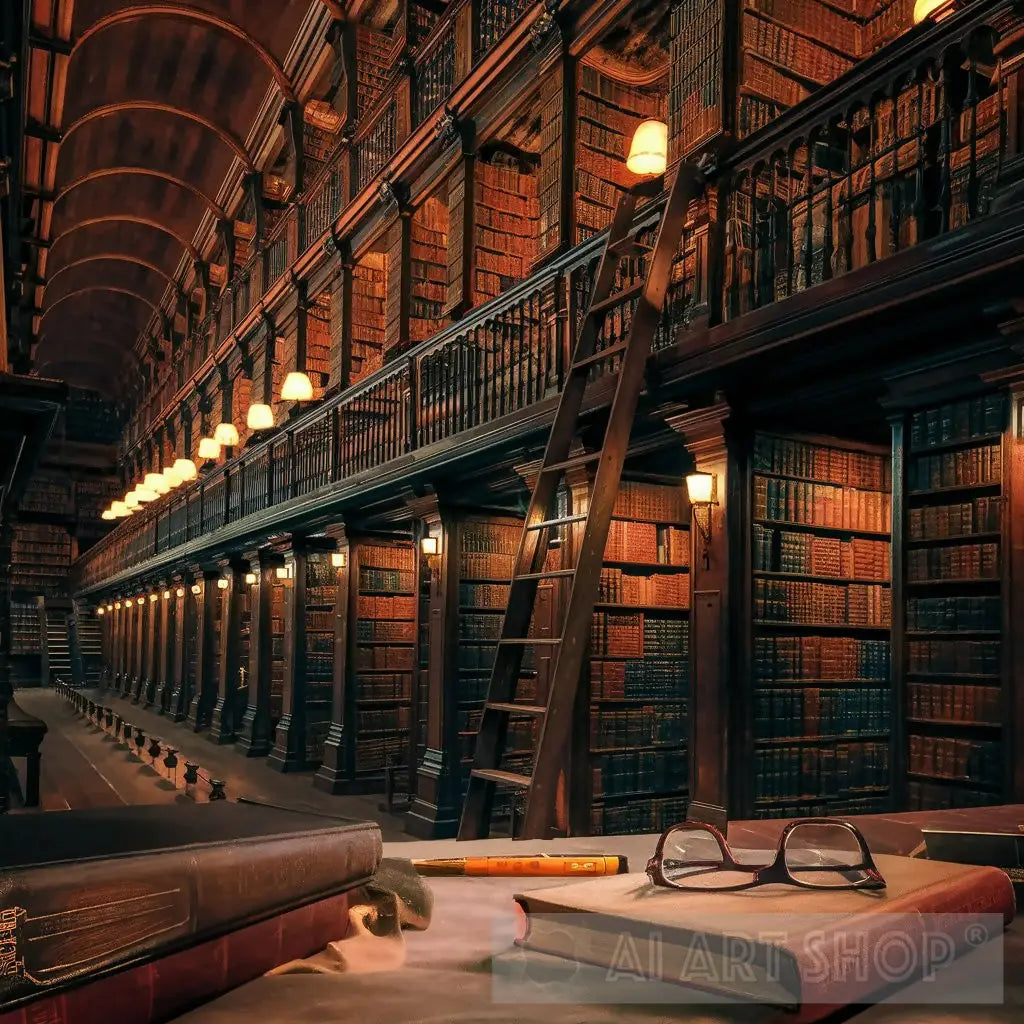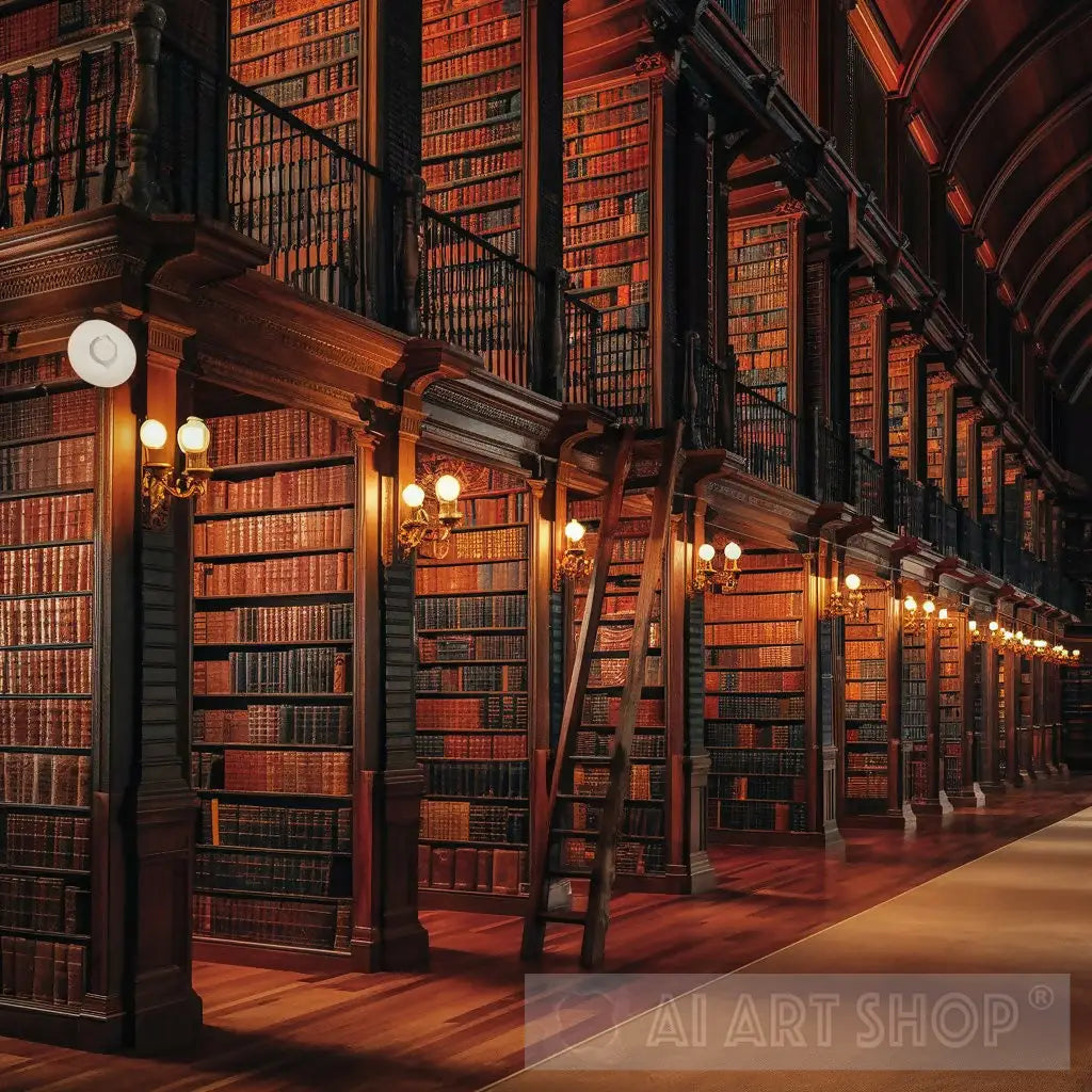 Step into a sanctuary of wisdom. A grand library bathed in warm lamplight, where towering bookshelves overflow with leather-bound secrets. A lone ladder leans against a shelf, beckoning you to explore the endless possibilities within.