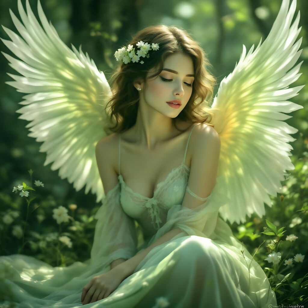 A radiant angel rests in quiet contemplation beneath the green canopy of a sun-dappled forest. Her delicate wings shimmer with soft golden hues, echoing the early morning light. Dressed in flowing sage green, she sits among tiny blossoms and wildflowers, her expression gentle and reflective. A crown of small white daisies adorns her hair, symbolizing purity and grace. This artwork captures a moment of silence, light, and serenity — a celestial whisper in nature’s sanctuary.