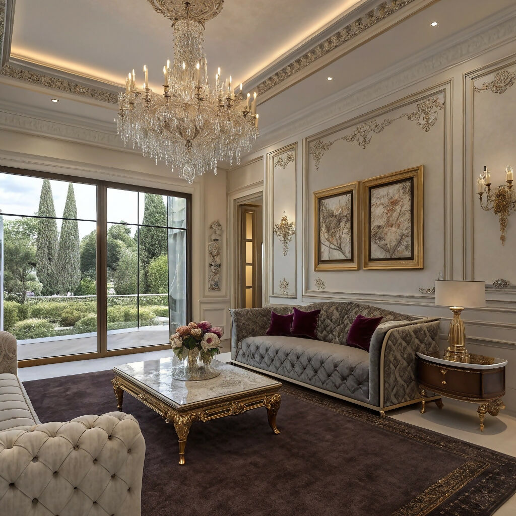 A large, luxuriously decorated living room is shown. A grand crystal chandelier hangs from the high ceiling, which has ornate crown molding. The walls are a light beige with detailed, gold-accented, decorative paneling outlining the walls and framing the artwork. Two framed prints are displayed on the wall, showcasing muted tones and a subtle, botanical theme.