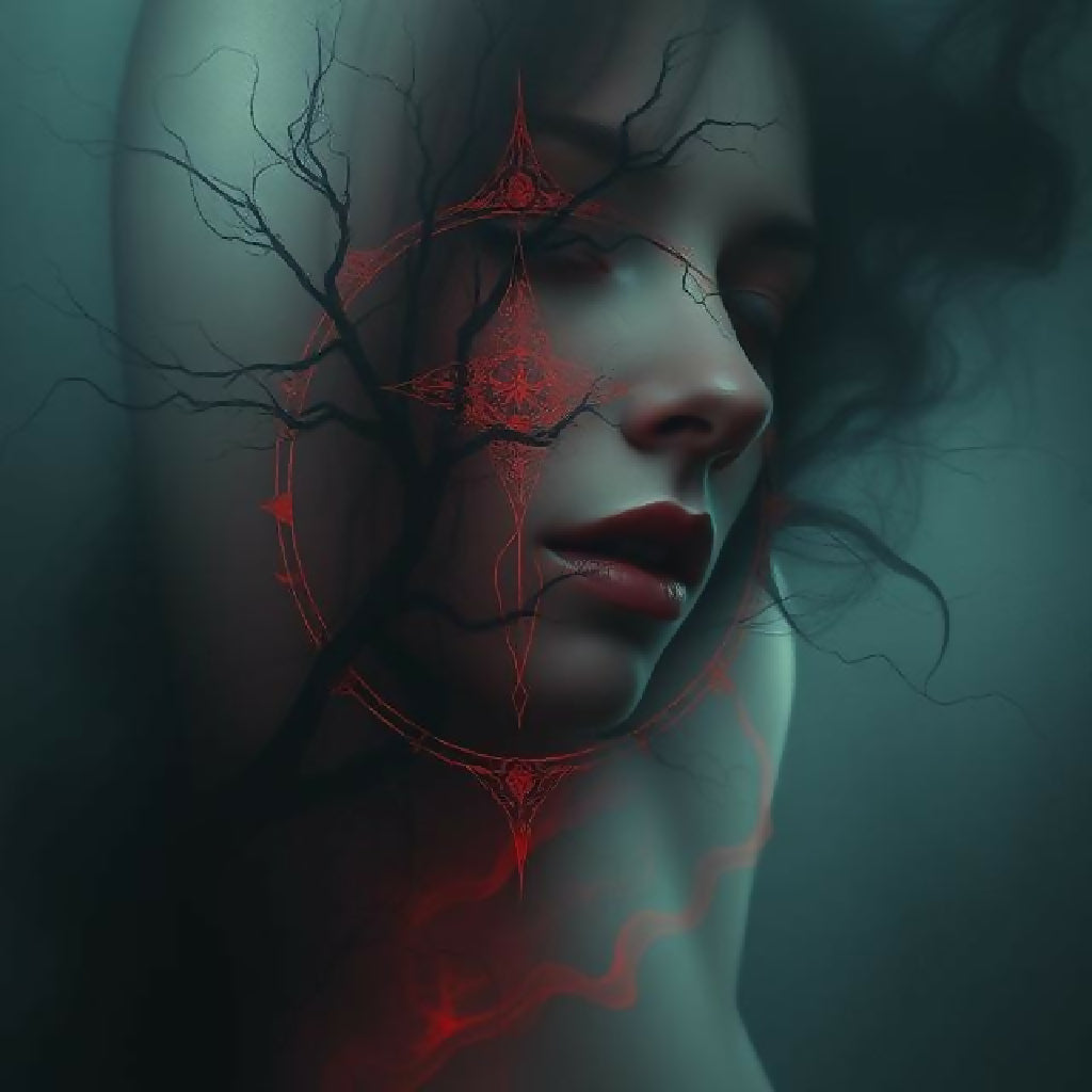 This close-up, dark and moody artwork features the profile of a pale woman with closed eyes, conveying a sense of introspection or perhaps slumber. Stark, dark, leafless branches appear to grow from behind or within her, intertwining with her form. Overlaying her face and extending onto her neck are intricate, glowing crimson patterns that resemble arcane sigils or a magical compass, with a central star-like motif. There are also subtle, red, wave-like or vein-like patterns emanating downwards from her. The overall impression is one of mystical depth, perhaps a connection to nature or ancient magic, or even a representation of inner turmoil or power.