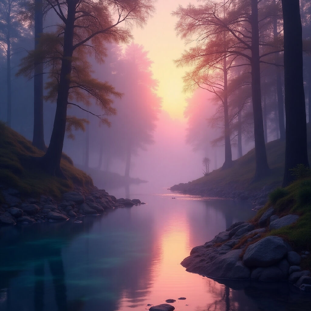 This AI-generated artwork captures a tranquil woodland at sunrise, with glowing purple mist, golden light rays, and a clear river reflecting pastel skies.
