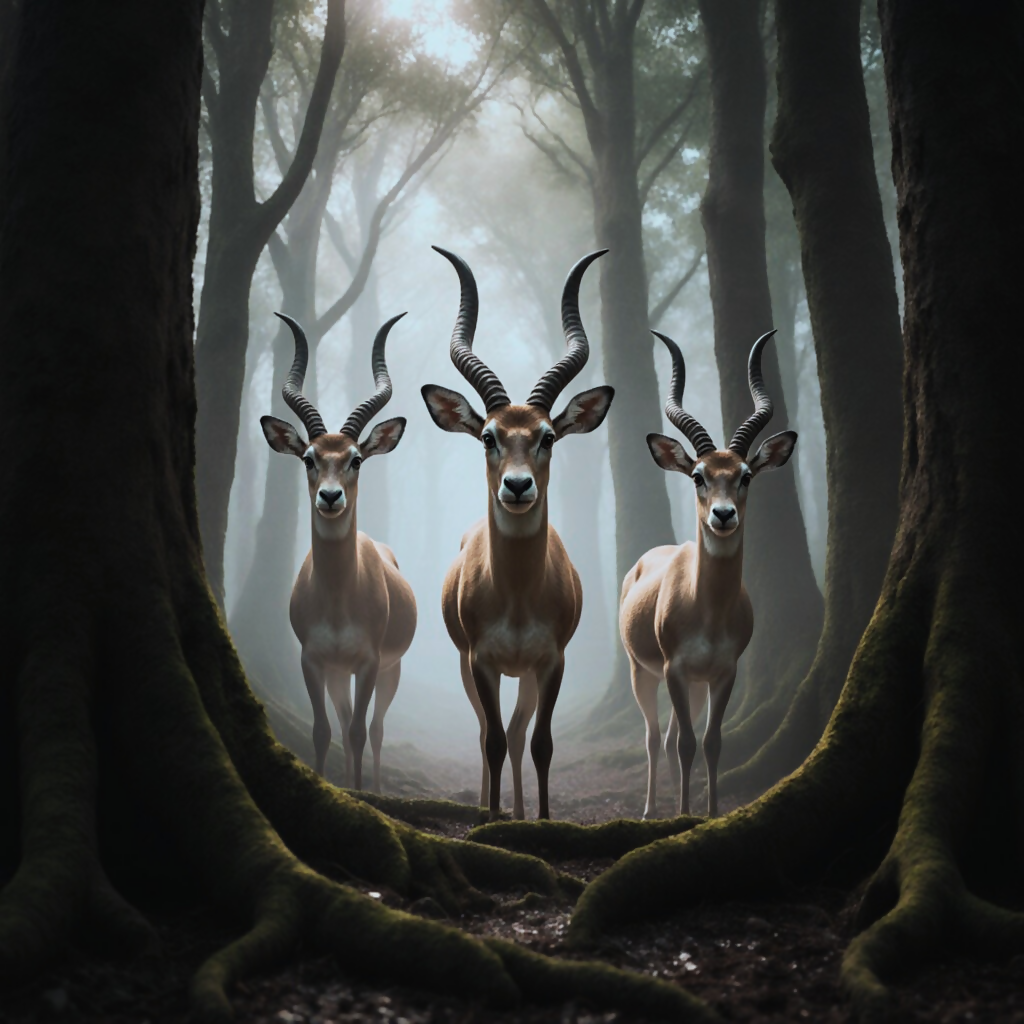 Three gazelles pause in an enchanted forest, their eyes locked with yours as though a secret is being shared. This hyper-realistic fantasy creation by The Future of Art blurs the line between wildlife photography and digital myth, offering a rare glimpse into nature’s sacred silence. Collectors of magical realism and wildlife-inspired digital art will find this piece both grounding and otherworldly.