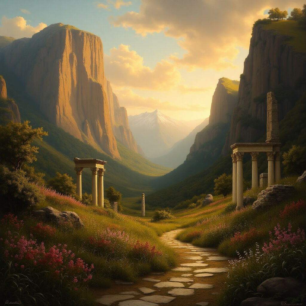 Breathtaking classical landscape unfolds in this golden-hued masterpiece, where towering cliffs frame a serene valley bathed in the warm light of a setting sun. A cobbled path meanders through lush meadows dotted with vibrant wildflowers, leading the viewer's eye toward distant, snow-capped peaks. Scattered among the grass stand ancient ruins—weathered columns and crumbling stone—silent remnants of a long-lost civilization. The scene captures a delicate balance between the grandeur of nature and the quiet poetry of history, evoking a sense of nostalgia, mystery, and timeless beauty.