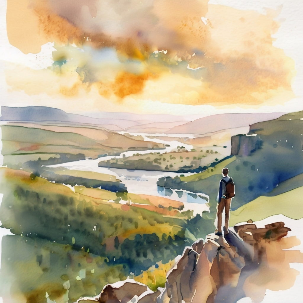 A lone traveler stands at the edge of a rocky cliff, gazing at the endless valleys and winding rivers bathed in golden light. The watercolor tones capture the harmony between earth and sky, evoking peace, reflection, and the quiet strength of solitude. It is a moment where nature speaks in silence, reminding us of the vastness of the world and the journey ahead.