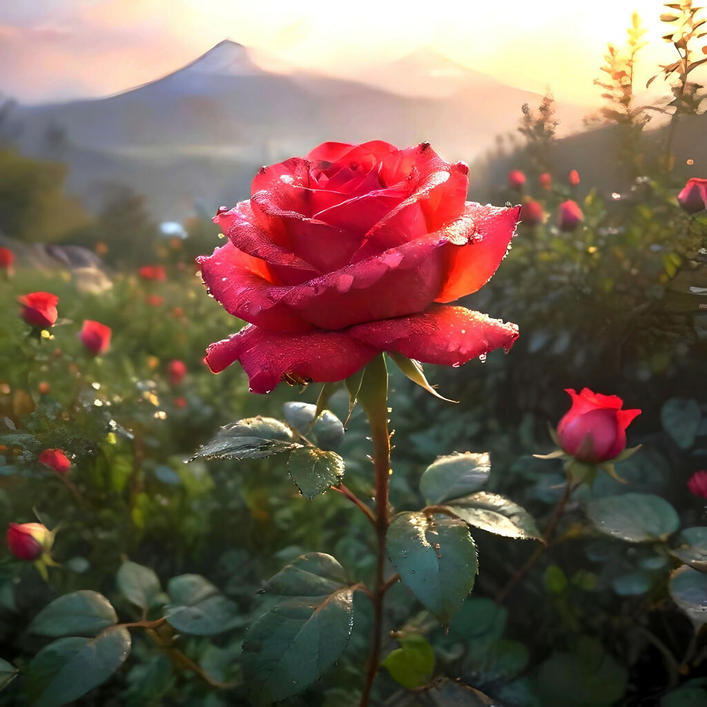 A radiant red rose stands proudly in the foreground, its velvety petals glistening with delicate dew drops that catch the morning light. Surrounding it are tender rosebuds and lush green leaves, each kissed by moisture, adding to the freshness of the scene. In the distance, majestic snow-capped mountains rise through a soft mist, bathed in the golden hues of sunrise. The contrast between the intimate detail of the flower and the vast serenity of the landscape creates a poetic harmony—symbolizing both the fragility and grandeur of nature.
