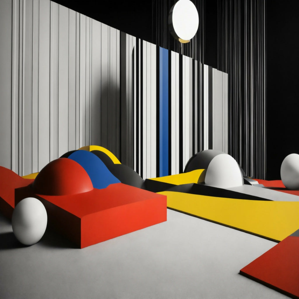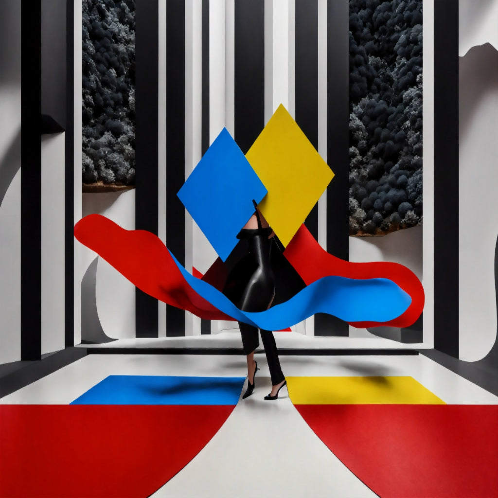 Around it, elongated shadows stretch across the landscape, bending and curving as if caressed by an unseen breeze. The sky is a muted gradient of pastel blues and pinks, with clouds that appear to dissolve into the ether. In the background, a distant, distorted figure—half-human, half-animal—stands still, its body composed of soft, flowing fabrics, symbolizing the intertwining of softness and strength.