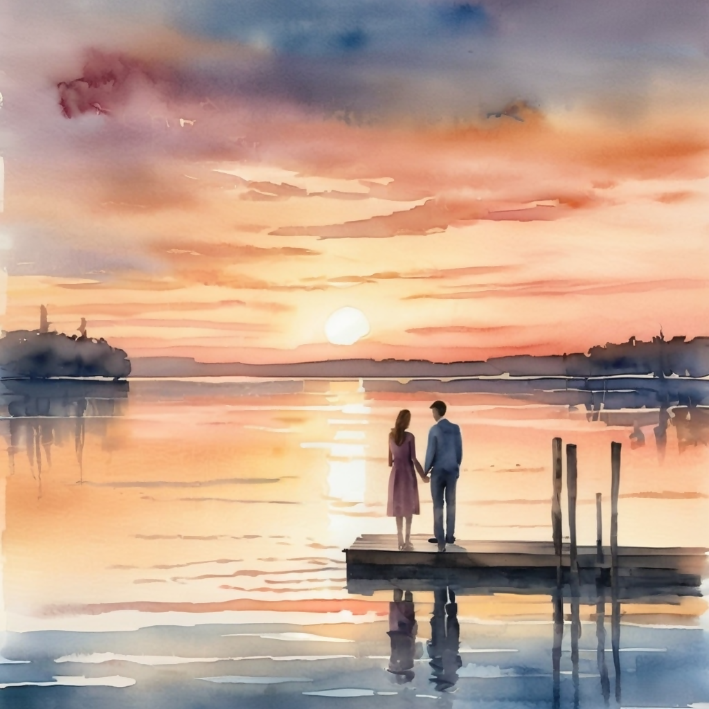 A delicate watercolor painting capturing a couple standing hand in hand on a quiet pier, gazing at the glowing sun as it sinks into the horizon. Soft pastel hues of pink, orange, and blue melt seamlessly into one another, reflecting on the calm surface of the lake. The artwork conveys serenity, intimacy, and the timeless beauty of a shared moment at dusk.