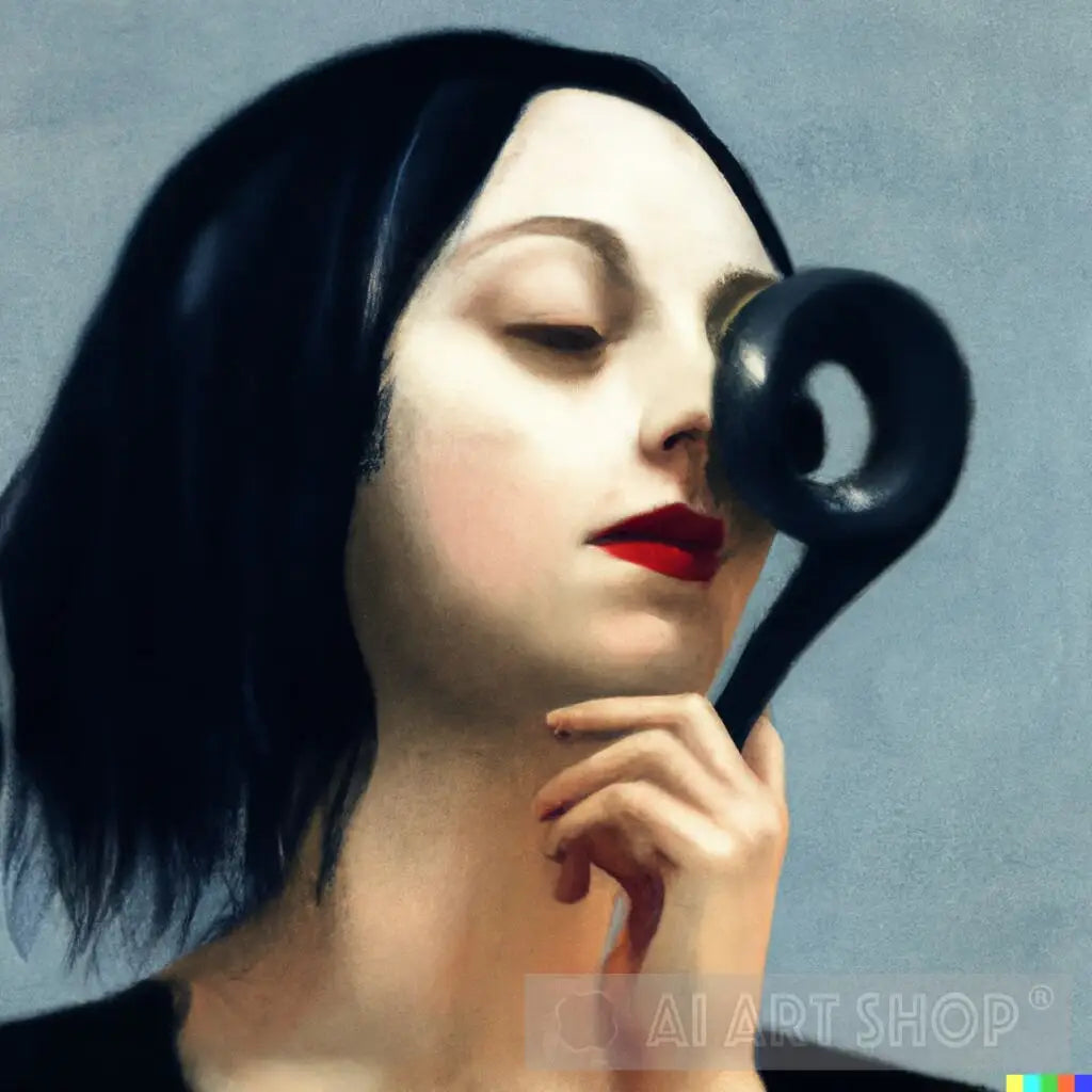 This artwork features a woman with striking contrasts, characterized by her glossy black hair and pale skin, accentuated by bold red lips. She holds a mysterious black object resembling a twisted horn close to her face, as if listening or speaking into it. The artwork conveys a sense of introspection or communication with an unseen force, rendered with a touch of surrealism that adds to its intriguing aura. The muted, soft background highlights the subject and the object, focusing attention on their interaction.
