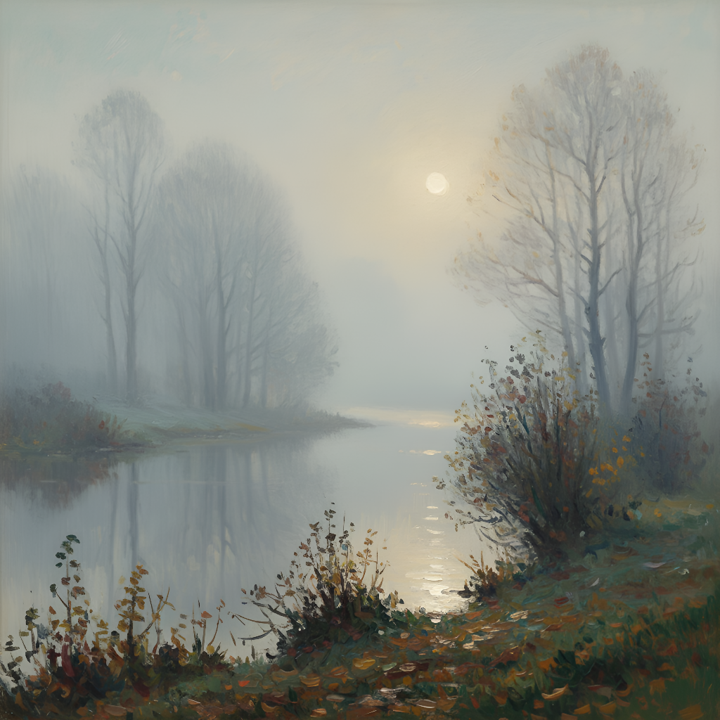 "Whispers of Winter's Dawn" invites you into a serene landscape where the world slowly awakens under a veil of mist. Inspired by the melancholic beauty of "Hazy Shade of Winter," this oil painting captures the quiet, contemplative moments as the first light breaks through. Bare trees, their forms softened by the fog, stand as stoic sentinels along the winding river, their reflections shimmering faintly on the water's surface. The sun, a muted orb in the hazy sky, casts a gentle, ethereal glow, hinting at the warmth to come while acknowledging the chill of the season. Detailed impasto textures bring the fallen leaves and riverside foliage to life, adding depth and a tactile quality that evokes the crisp air. This piece is a perfect meditation on transition, the beauty of quiet solitude, and the hopeful promise of a new day, even amidst winter's embrace. It's a timeless scene that speaks to the heart, offering a peaceful escape and a touch of classic impressionistic charm for any space.