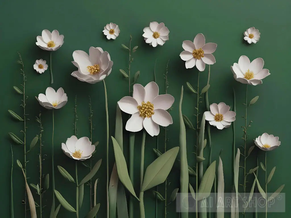 A creative image with wildflowers rendered in 2D and 3D with a deep green background. Each flower is painted with a soft, faint dye, creating a contrasting effect. The image resolution is high (2500K, which allows you to appreciate every detail in the flowers and the background. The illustration conveys a feeling of tranquility and natural welcome.