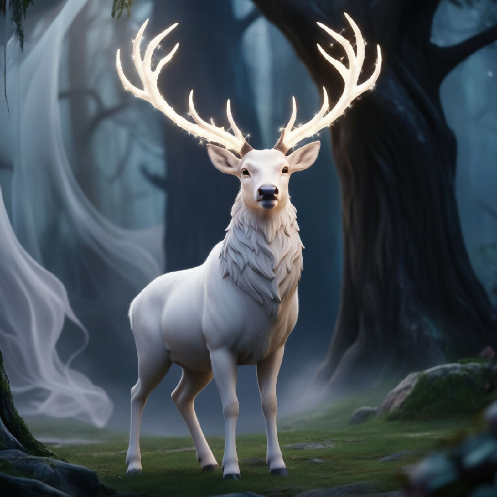 "Presenting the Majestic White Stag, a breathtaking depiction of ethereal beauty and power. Standing proudly in an enchanted forest, the stag's glowing antlers are adorned with small, sparkling lights, casting a mystical aura. The serene expression and graceful stance of the stag, coupled with the misty, magical background, create a sense of wonder and majesty, making this artwork a captivating addition to any collection."