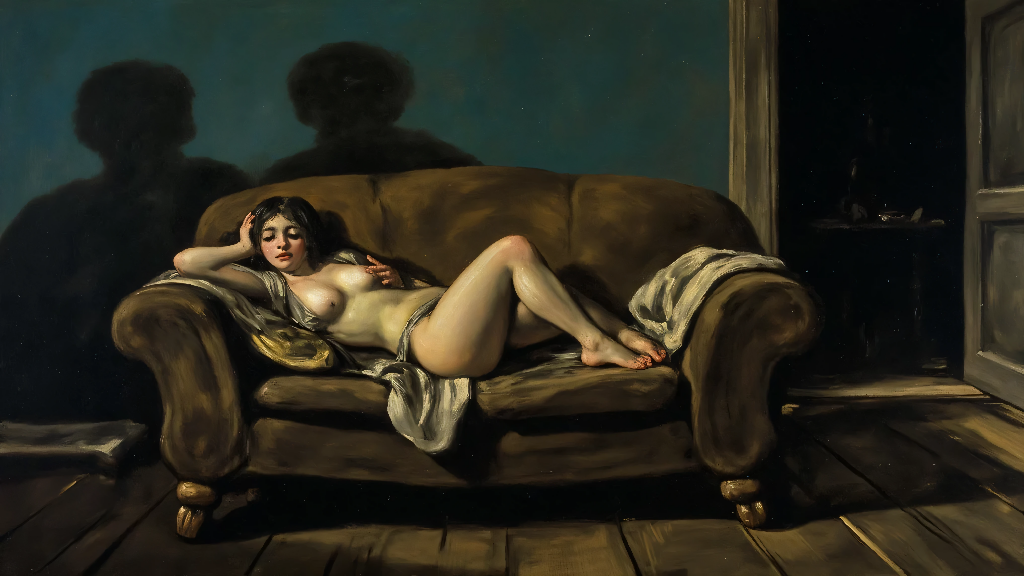 Inspired by the style of Goya’s Black Paintings, this piece evokes a sense of sorrow, beauty, and mystery. What do the shadows that linger near the girl desire? What lies beyond the door? I choose to leave these questions open to the viewer’s interpretation.