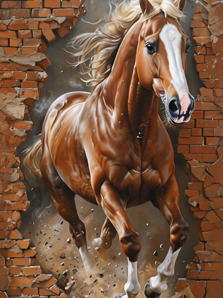 A dynamic and powerful digital painting depicting a chestnut horse bursting through a brick wall. The horse's muscular body and flowing mane convey a sense of strength and energy, while its determined expression suggests a wild and untamed spirit. The contrast between the smooth, sleek coat of the horse and the rough texture of the brick wall creates a visually striking composition. This artwork is a celebration of freedom and the untamed beauty of nature.