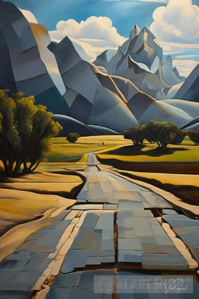 In the cubist rendition of pastoral tranquility, the countryside unfolds in fragmented splendor, a kaleidoscope of shapes and hues. A solitary road winds its way through the canvas, a testament to journeys both physical and metaphorical. Yellow barley fields flank the path, their golden waves undulating in rhythmic abstraction. Clusters of trees emerge as vibrant green islands amidst this geometric landscape, their forms echoing the angularity of the cubist vision. Above, snow-capped peaks pierce the azure sky, their sharp edges softened by billowing cumulus clouds. Here, in this fractured yet harmonious composition, nature's timeless allure is refracted through the prism of artistic interpretation.