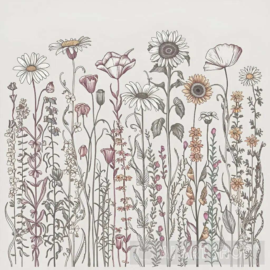 A simple and elegant line drawing of a field of wildflowers. The flowers are all different shapes and sizes, and they are all arranged in a delicate and graceful way. This design would be perfect for anyone who loves flowers and nature.