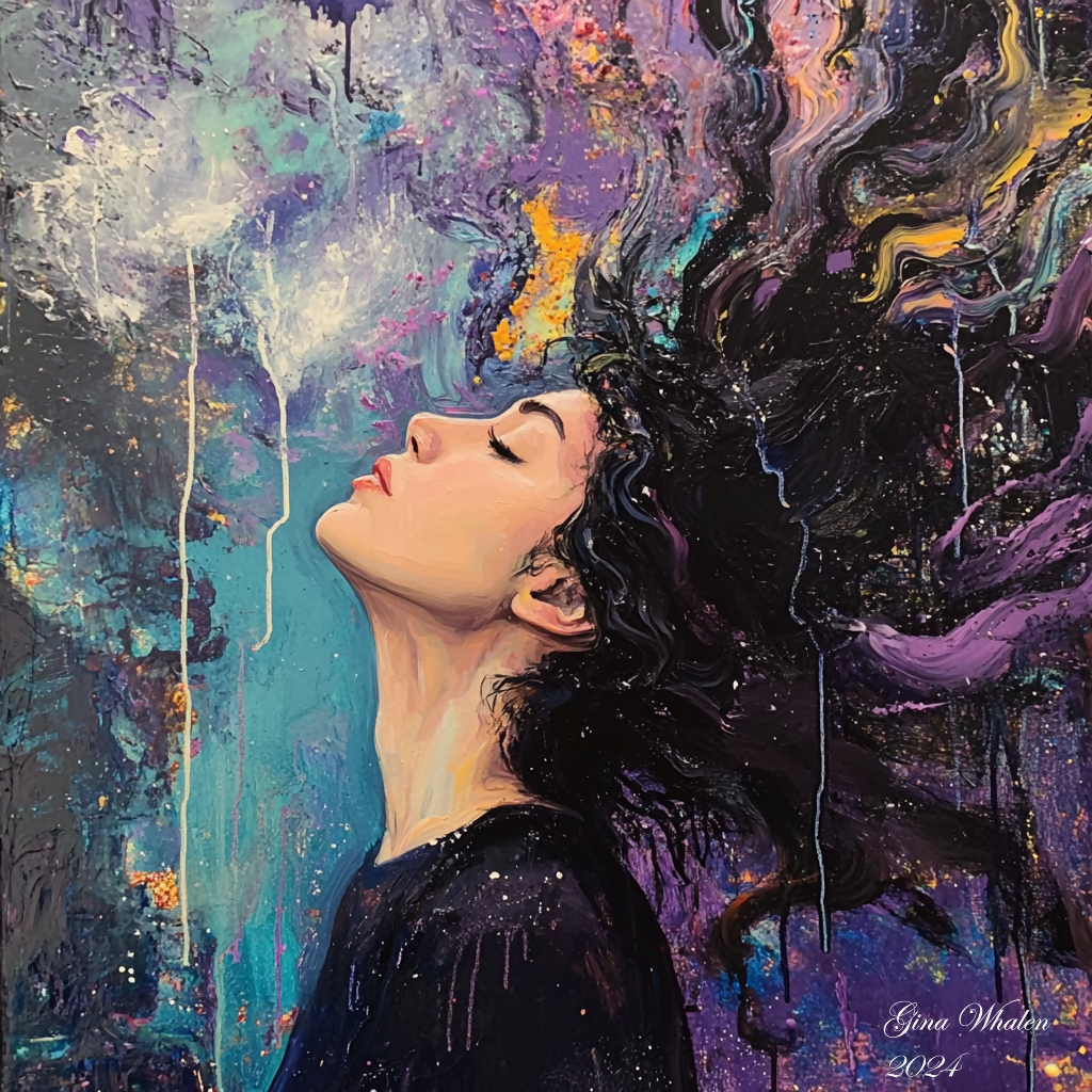 A woman with closed eyes is depicted, her dark hair flowing upwards as if caught in a mystical wind. Vivid colors in blues, purples, and oranges swirl around her, creating an ethereal, dreamlike atmosphere.