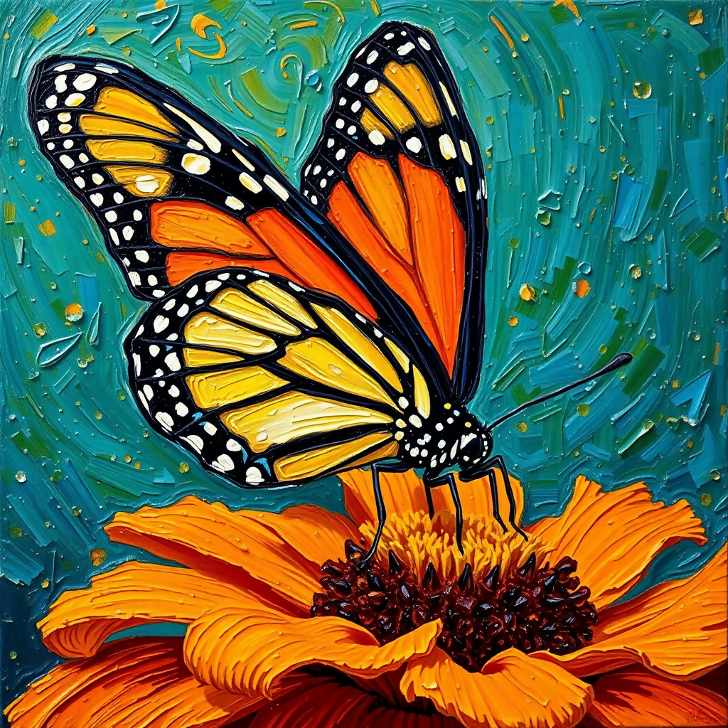 This stunning macro photograph captures the intricate beauty of a monarch butterfly delicately perched on a vibrant orange flower. The rich, fiery hues of the flower contrast beautifully with the butterfly's striking black-and-orange wings, adorned with delicate white spots. Every detail—from the fine texture of the butterfly's scales to the velvety petals of the bloom—is rendered in exquisite clarity, showcasing nature's artistry at its finest. The image invites viewers to marvel at the fragile yet powerful connection between flora and fauna, celebrating the harmony of life in vivid color.
