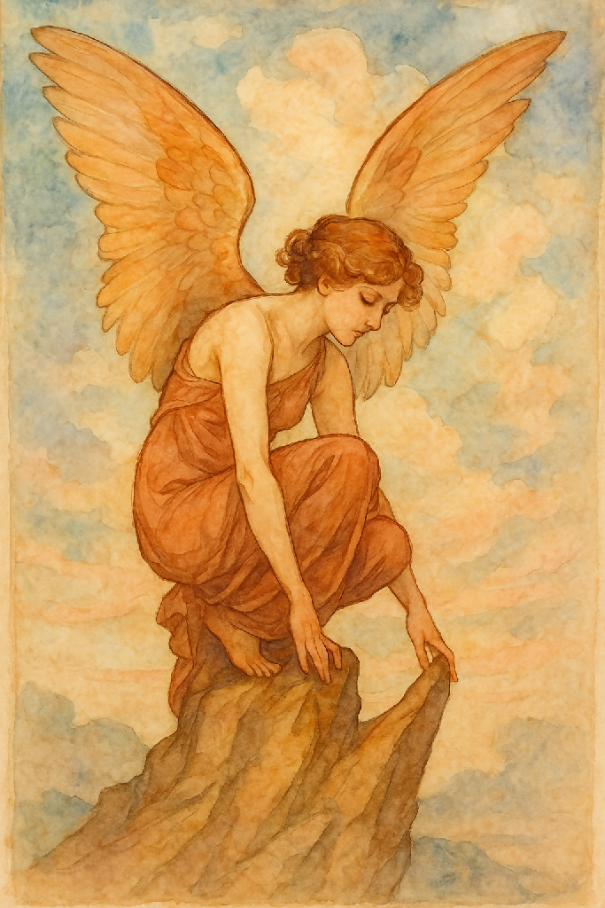 "Perched upon the edge of stone, she embodies both strength and grace—where earthly stillness meets celestial flight."