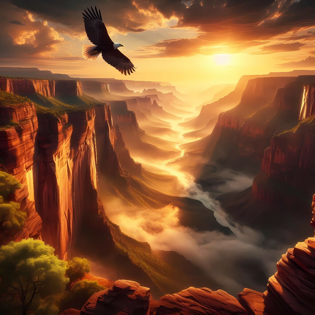 “Wings Over Eternity” is a breathtaking digital masterpiece capturing the awe of a vast canyon at sunrise. Golden light floods the layered cliffs and misty valleys below, while a soaring eagle glides across the sky—symbolizing freedom and timeless power. With cinematic depth and painterly detail, this piece evokes grandeur and serenity, making it perfect for upscale spaces, gallery walls, or luxury interiors. Delivered in ultra-high resolution for flawless large-format printing.