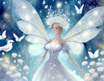 A Winter Fairy surrounded by white birds and butterflies with a crown of white flowers