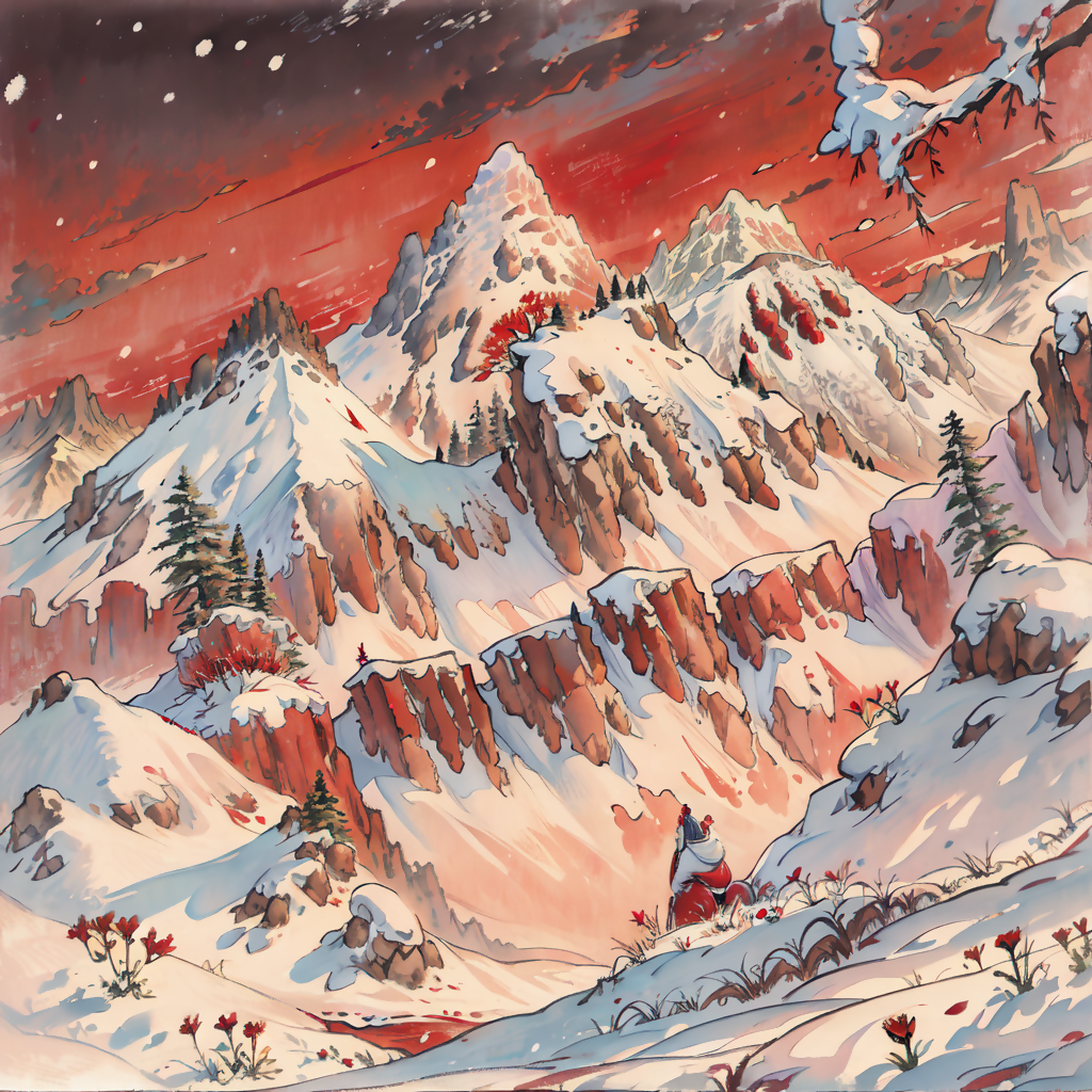 Winter Mountain and Bloodied Sky is a 100% original AI painting, created to be sold at the AI Art Shop.