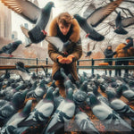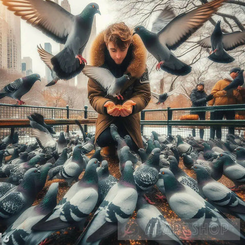 Man in parka feeds a flock of hungry pigeons in NYC during the cold winter months.