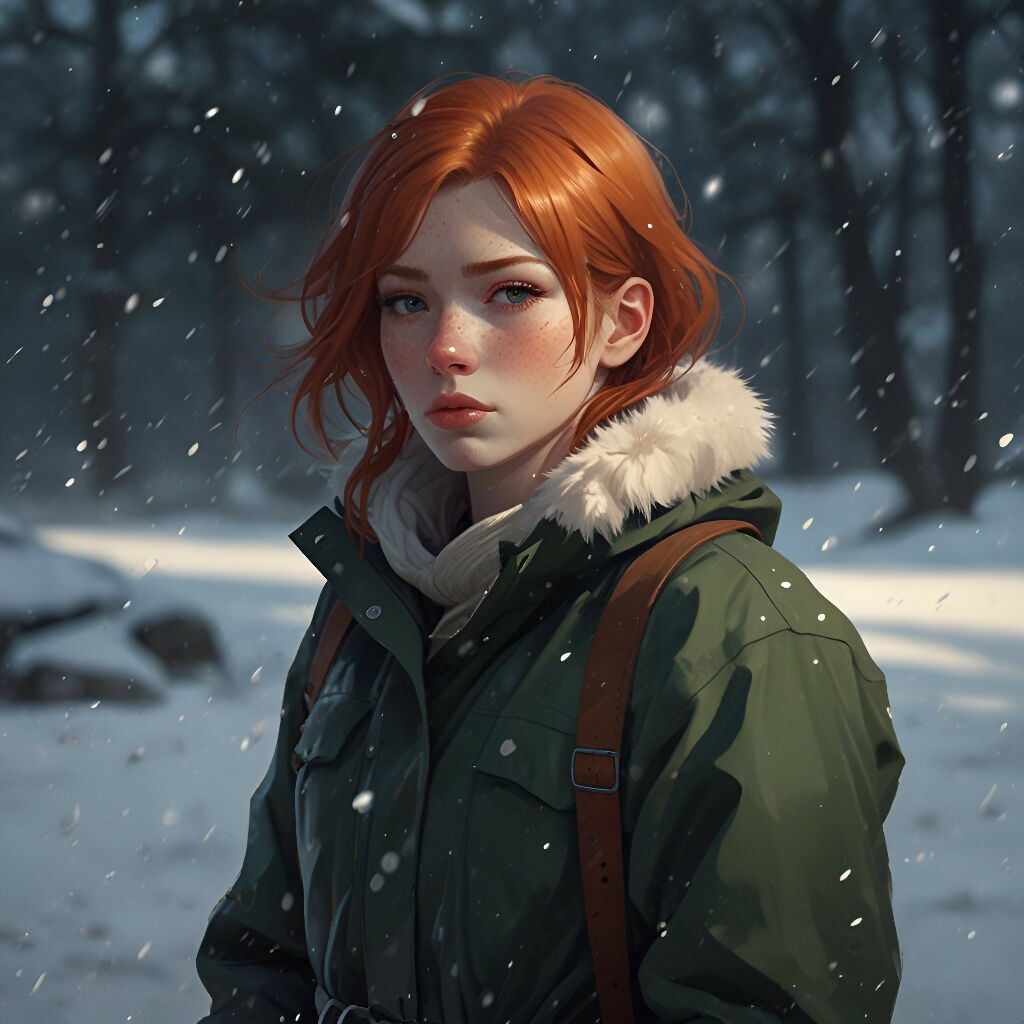 A woman with red hair is standing outdoors in the snow, wearing a green coat. The scene captures the essence of winter, showcasing her clothing and the chilly environment.