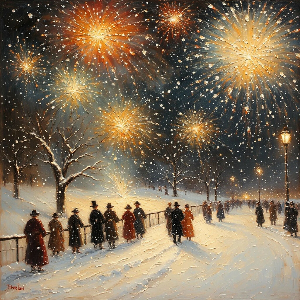 This painting captures a magical winter night scene, where a crowd of people, bundled in warm coats and hats, gathers along a snow-covered path. Above them, the dark sky is brilliantly illuminated by a dazzling display of golden and orange fireworks, casting a warm glow on the pristine white landscape.