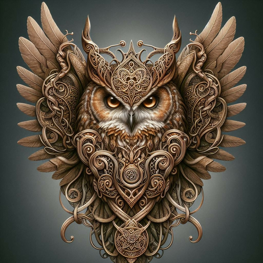 Tags: owl, ornamental design, celtic art, filigree, symmetrical illustration, wisdom, nocturnal animal, detailed line art, fantasy bird, decorative