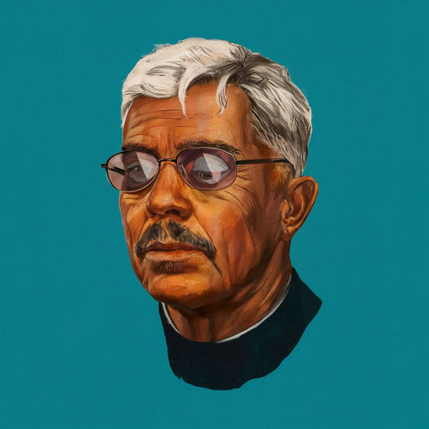 Step into the world of "Wisdom's Gaze," a striking digital portrait that captures the essence of experience and knowledge. This illustration features a distinguished older gentleman with silver hair and a mustache, his piercing eyes peering through round glasses. Set against a vibrant teal background, the portrait's hyper-realistic style brings out every wrinkle and expression, telling a story of a life well-lived. The subject's black turtleneck adds a timeless sophistication to the piece, making it perfect for those who appreciate art that speaks to the depth of human character.