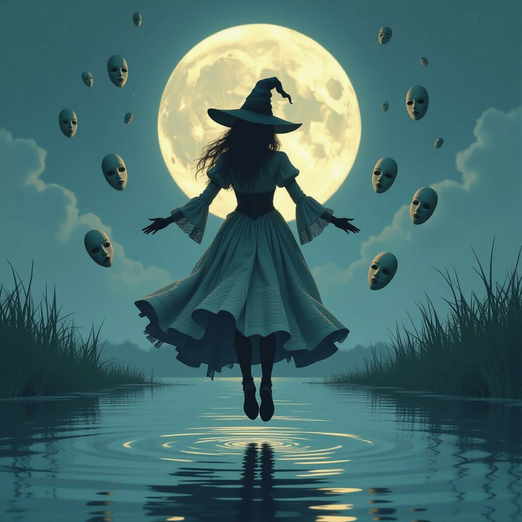 This image shows a witch hovering above a dark lake, encircled by emotion masks. The artwork features muted colors and subtle lighting in a surreal, dreamlike aesthetic.