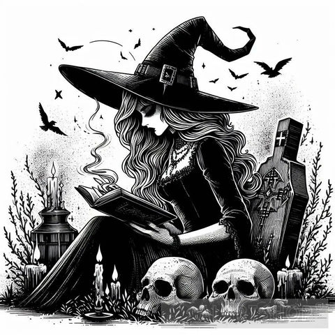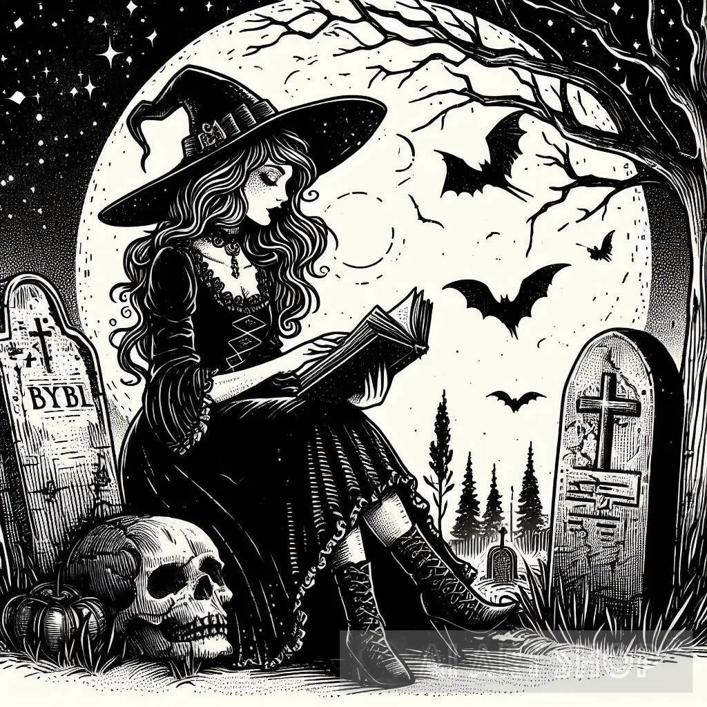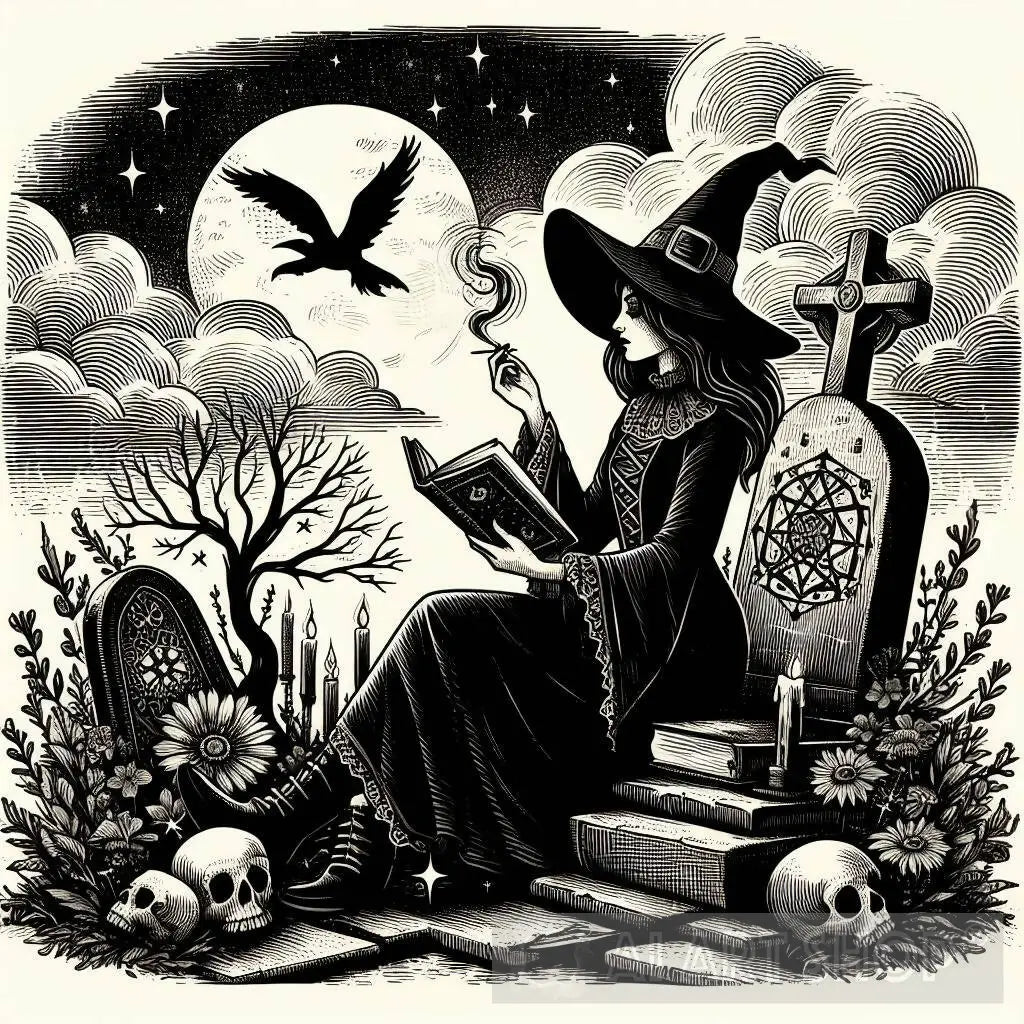 Witch sitting on a grave reading a book, Vintage Gothic Dark Academia Aesthetic Occult Goth Witchcraft Witchy, line art,