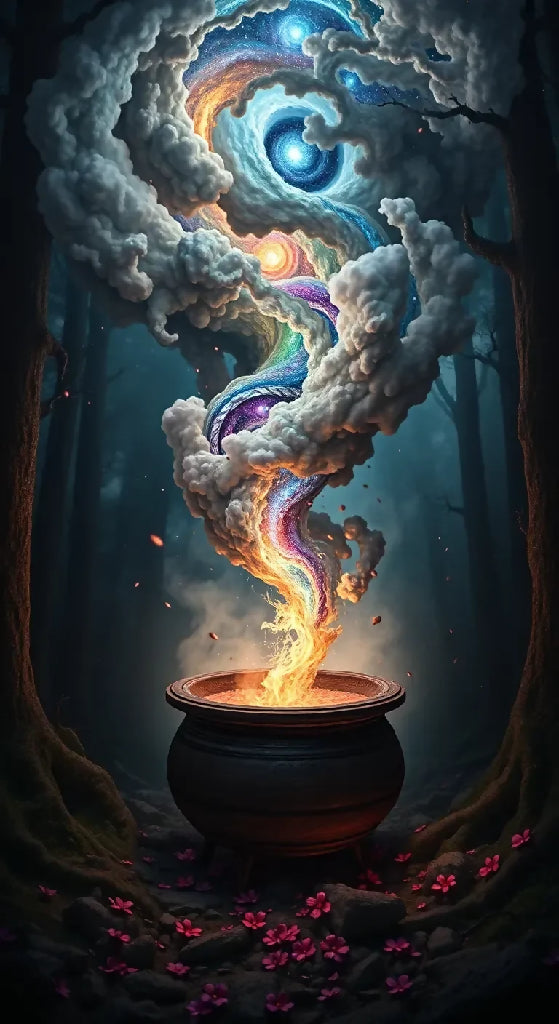 Cauldron casting a new World in the middle of the dark woods.
