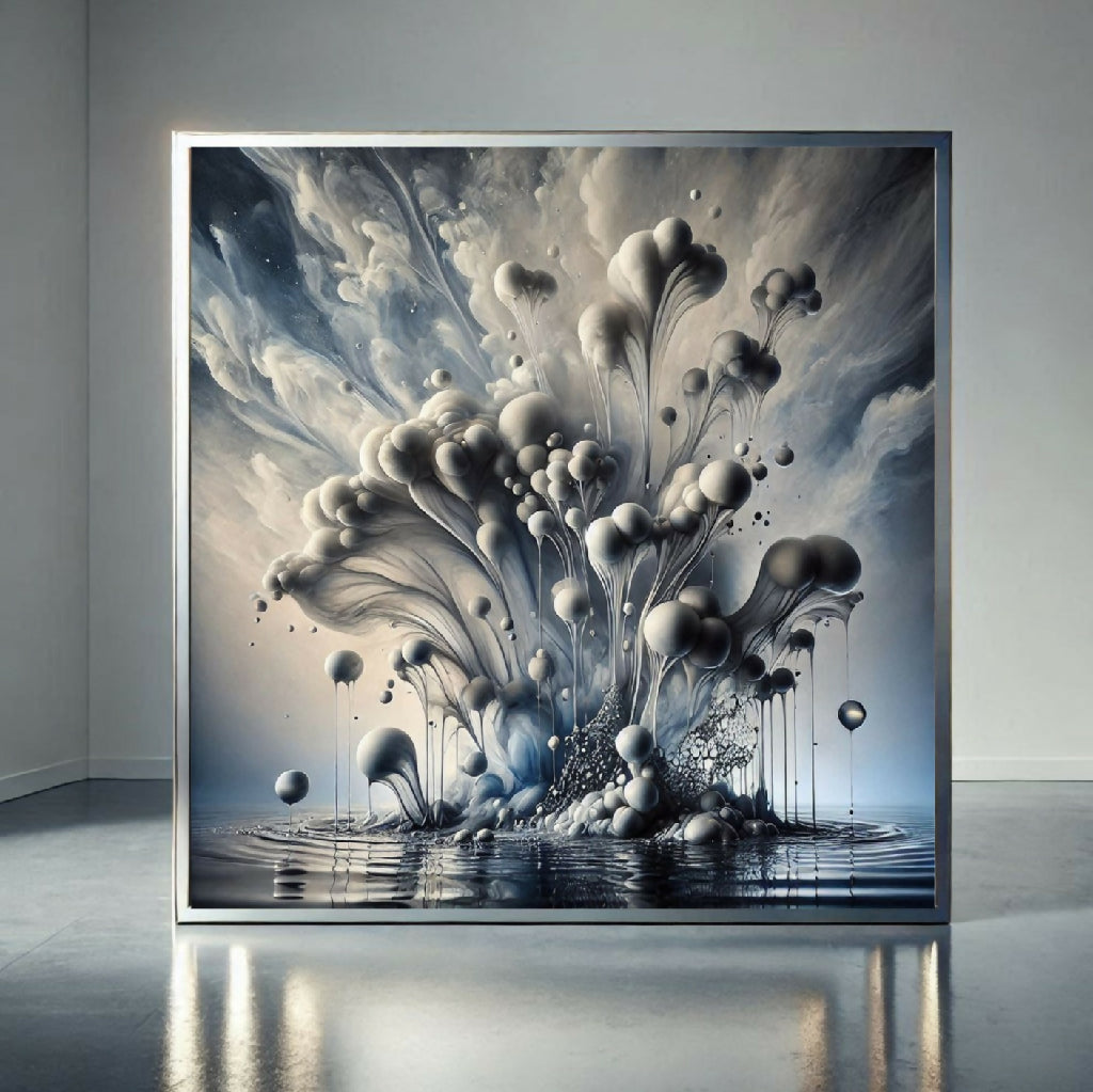Eine Farb-Explosion in Wasser. Die Farbe ist eine Mischung aus Grau und Weiß und hat eine blumenartige, organische Form. Die Wolken brechen aus einem zentralen Punkt heraus, einige Tropfen fallen in das umgebende Wasser. Das Gesamtbild wirkt abstrakt und künstlerisch.